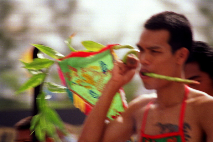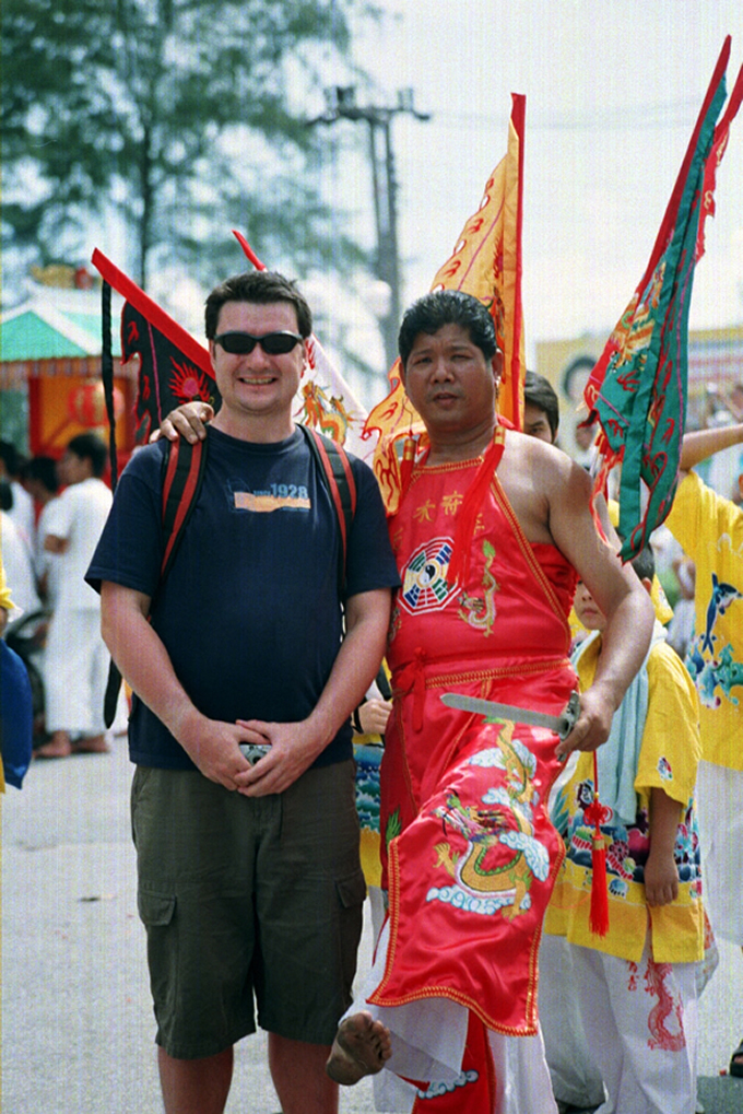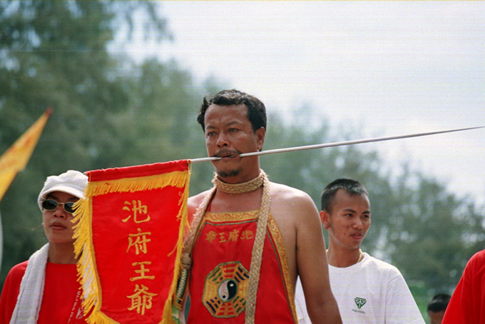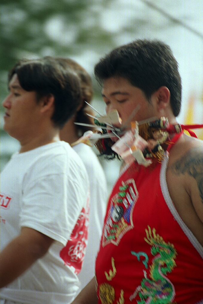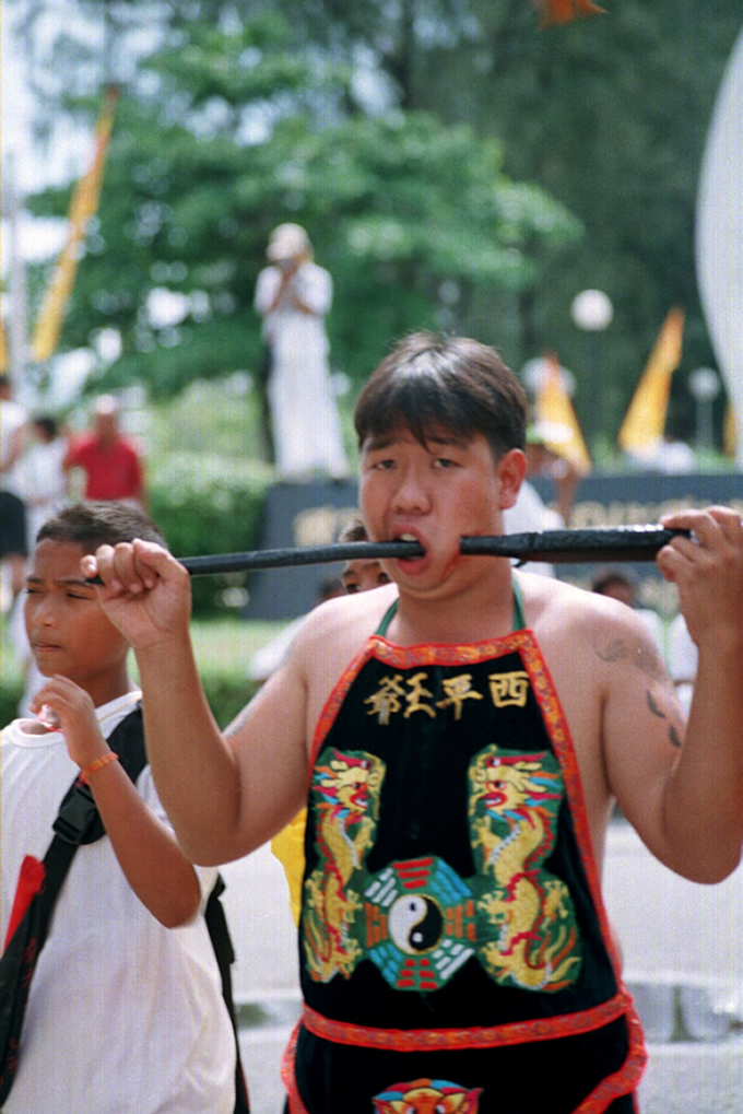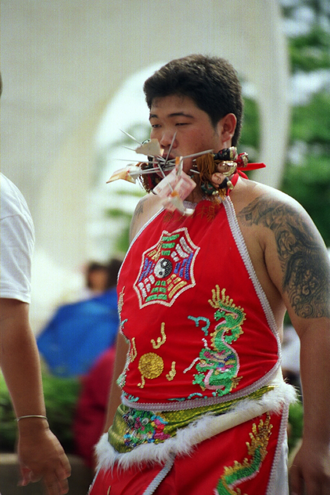 One of the most exciting aspects of the festival is the various, (and sometimes gruesome) ceremonies which are held to invoke the gods. Firewalking, body piercing and other acts of self mortification undertaken by participants acting as mediums of the gods, have become more spectacular and daring as each year goes by. Men and women puncture their cheeks with various items including knives, skewers and other household items. It is believed that the Chinese gods will protect such persons from harm, and little blood or scarring results from such mutilation acts. This is definitely not recommended for the feint hearted to witness.”